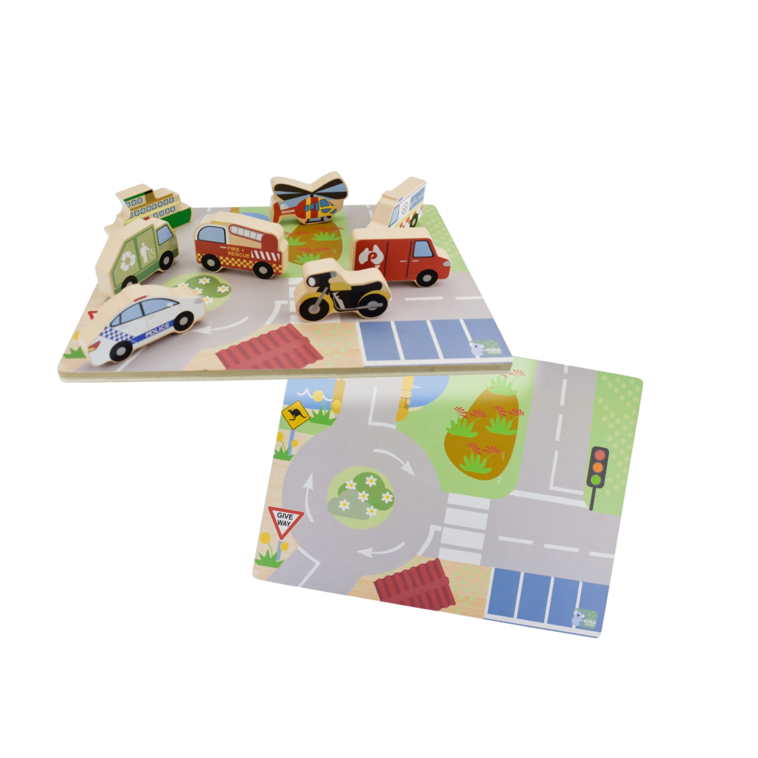 Match each chunky wooden vehicle piece to its outline on the sturdy puzzle board, or flip the board over to reveal a vibrant Aussie road scene for pretend play. From the bustling post van to the brave fire truck, speedy police car, and friendly Sydney ferry, kids can explore air, land, and water transport while creating endless adventures.