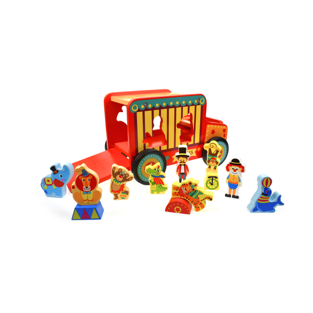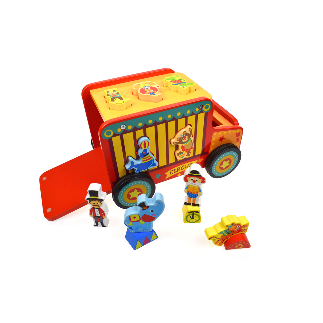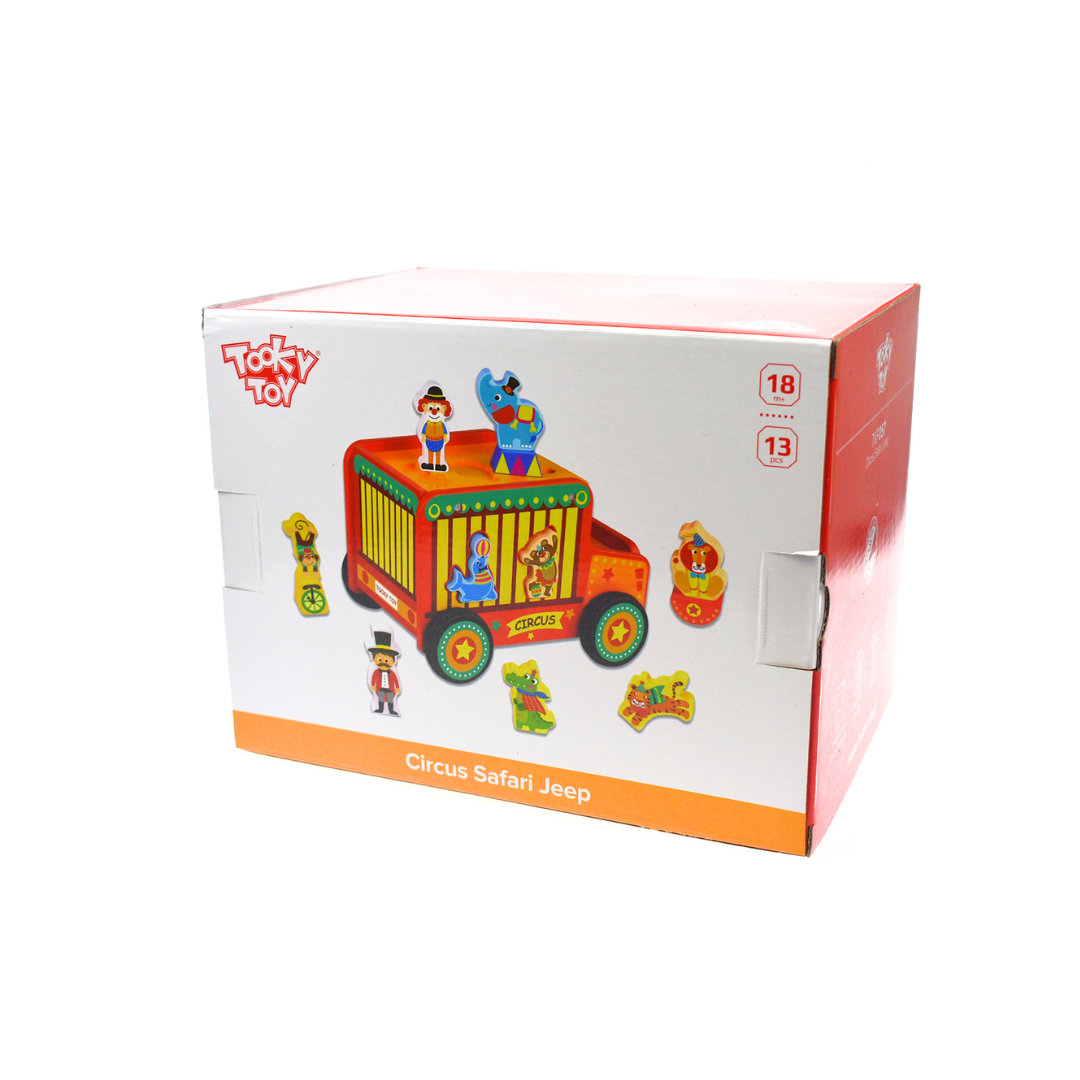 Push the animals through the holes in the jeep, or pack up the animals and move your circus to a new location. Run your own circus show and play pretend! This Shape Sorter includes a clown, unicycle, elephant, tiger, ringmaster, seal, dancing bear, lion, monkey, and a crocodile. The beautiful bright colours and gorgeous wooden pieces are aesthetically pleasing and fun!