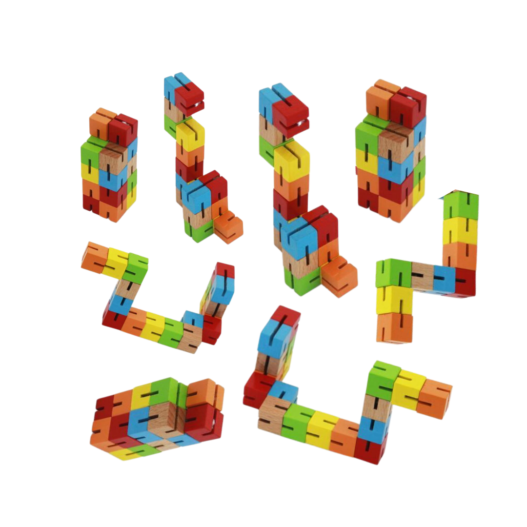 Fidget and twist this Colourful Wooden Fidget Toy! Manipulate it into different shapes and designs, like a stick, or cube, or dog.
