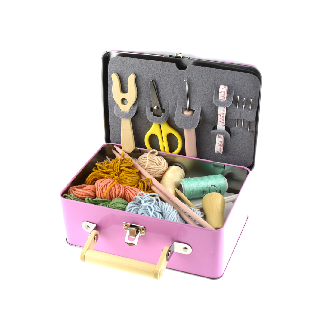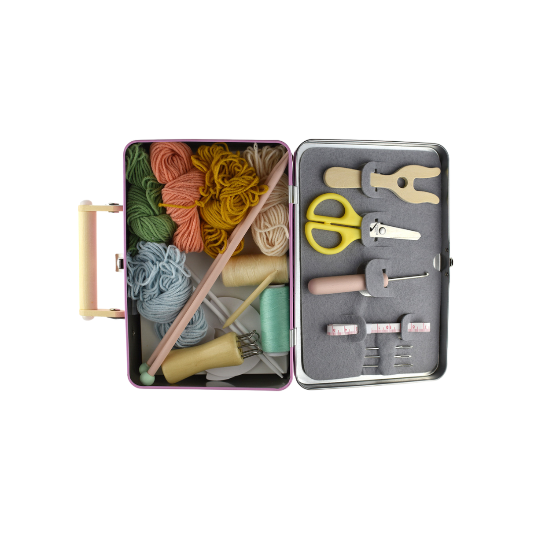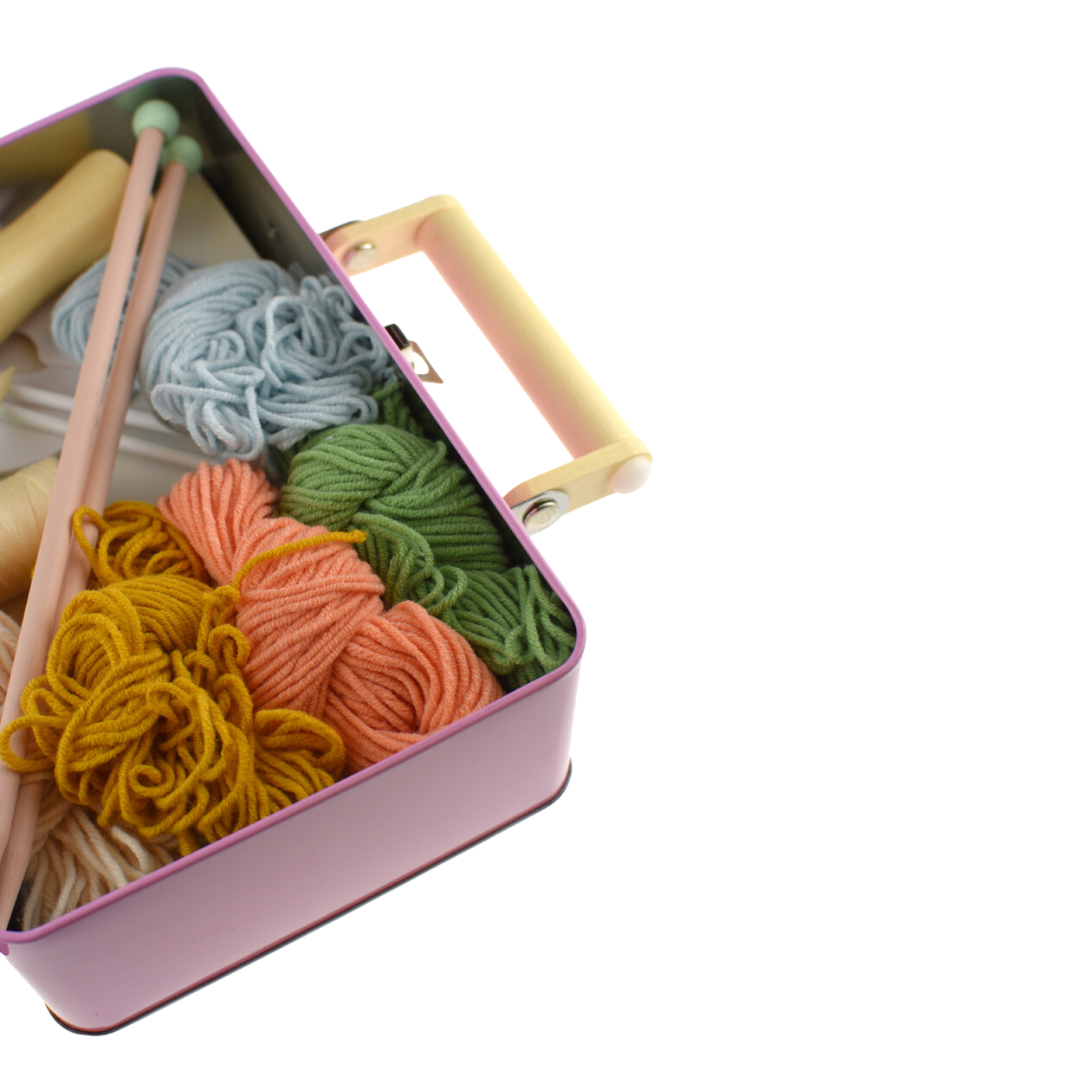 Our Knitting Kit in Tin Case is a beautiful set of knitting accessories with vibrant coloured wools.