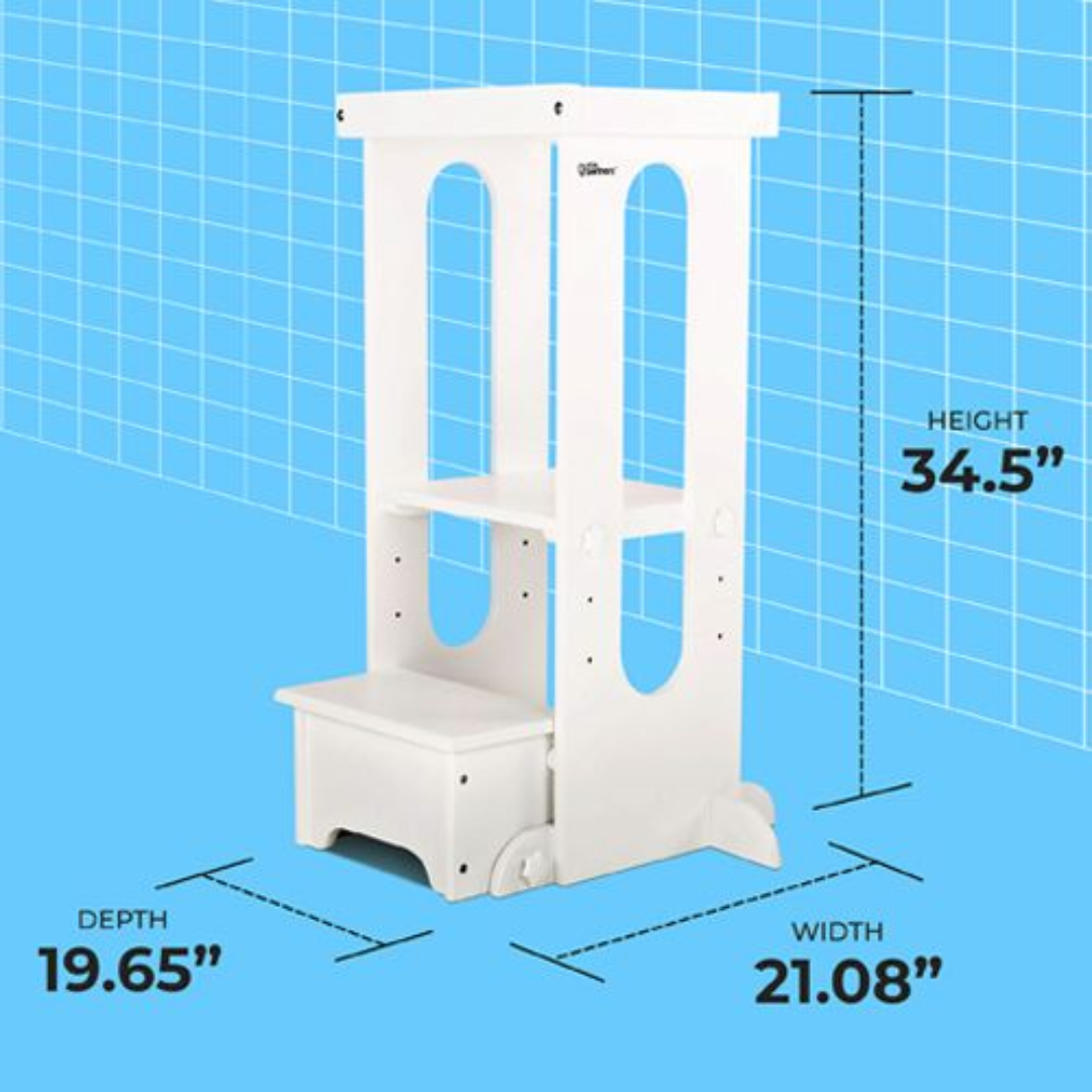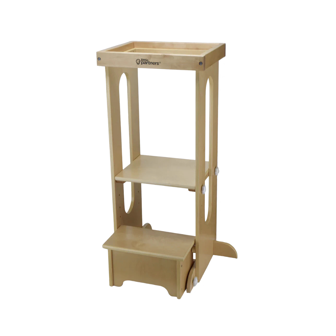 Sturdy, compact profile and fold-up bottom step makes the Explore N’ Store Learning Tower a perfect fit for under kitchen counters and islands.