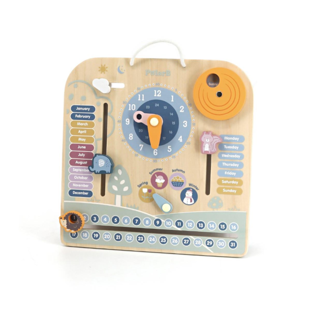 Move the minute and hour hands of the clock to match the time and slide the hedgehog to the correct date. Lift the elephant so his trunk points at the correct month, and tell the squirrel what day it is. Twist the knob to show the weather, and lever to the correct season. This interactive wooden calendar and clock teaches awareness of the time and weather, while stimulating imaginative, open-ended play and improving fine motor skills and finger strength. Hands-on-play through this calendar makes the difficult concepts of time, weather and seasons easy for toddlers to learn!