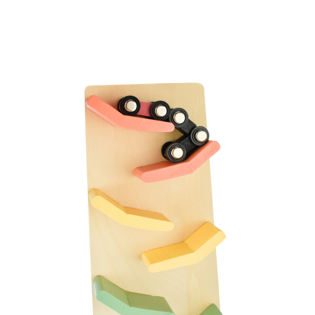 Embark on a delightful adventure with the Pastel Rolling Car Tumble Tower. Made for little hands, watch their delight as children send the cars racing down the finely crafted wooden track!