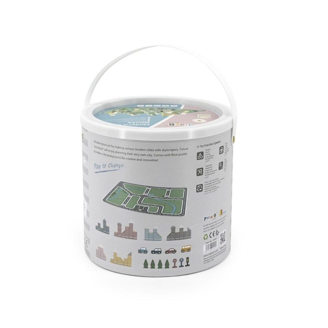 This bucket of blocks includes 56 wooden blocks in varying shapes and sizes, and a wooden puzzle floormat. Building and construction develops fine motor skills and cognitive development. Promotes social interaction, sharing and communication skills as kids build and stack and create cities together.