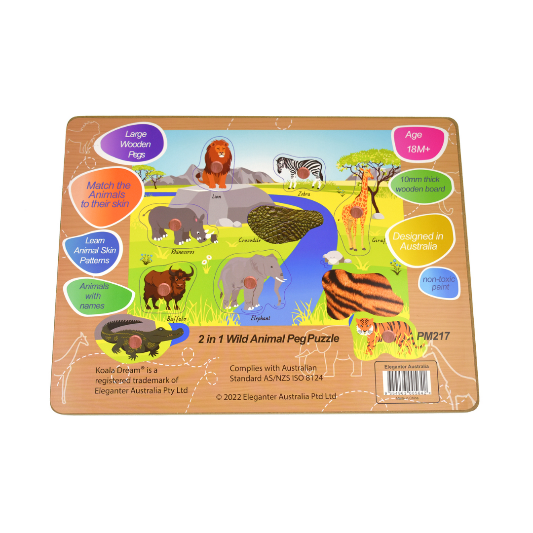 Learn the animals of the safari with our Wild Animal Wooden Peg Puzzle! This 2 in 1 Puzzle teaches children about the animals’ names and their unique patterned skins.