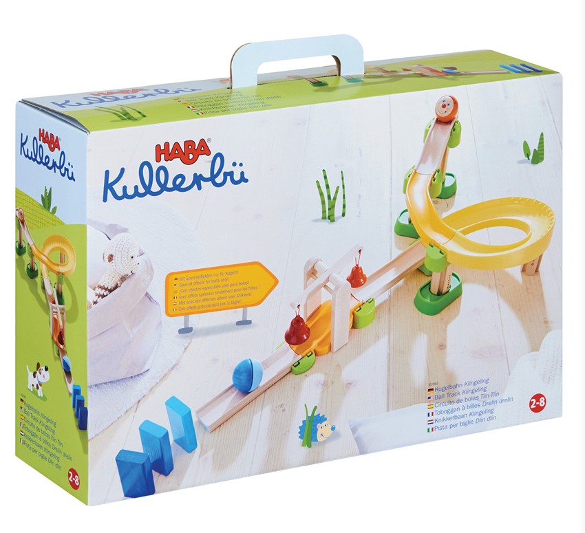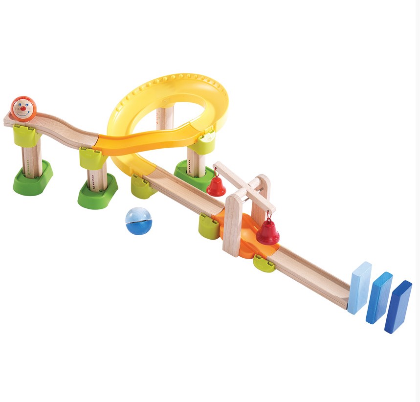 The wooden pieces of the Wooden Ball Race Track are made in Germany from eco-friendly PEFC sustainable beech wood and the set includes a 2 bell hinge block, 1 steep ball curve, 9 connecting elements, 1 wavy curve, 2 straight tracks, 1 ramp, 1 starting block, 4 columns, 1 Paul ball, 1 special effects ball and 3 domino blocks.