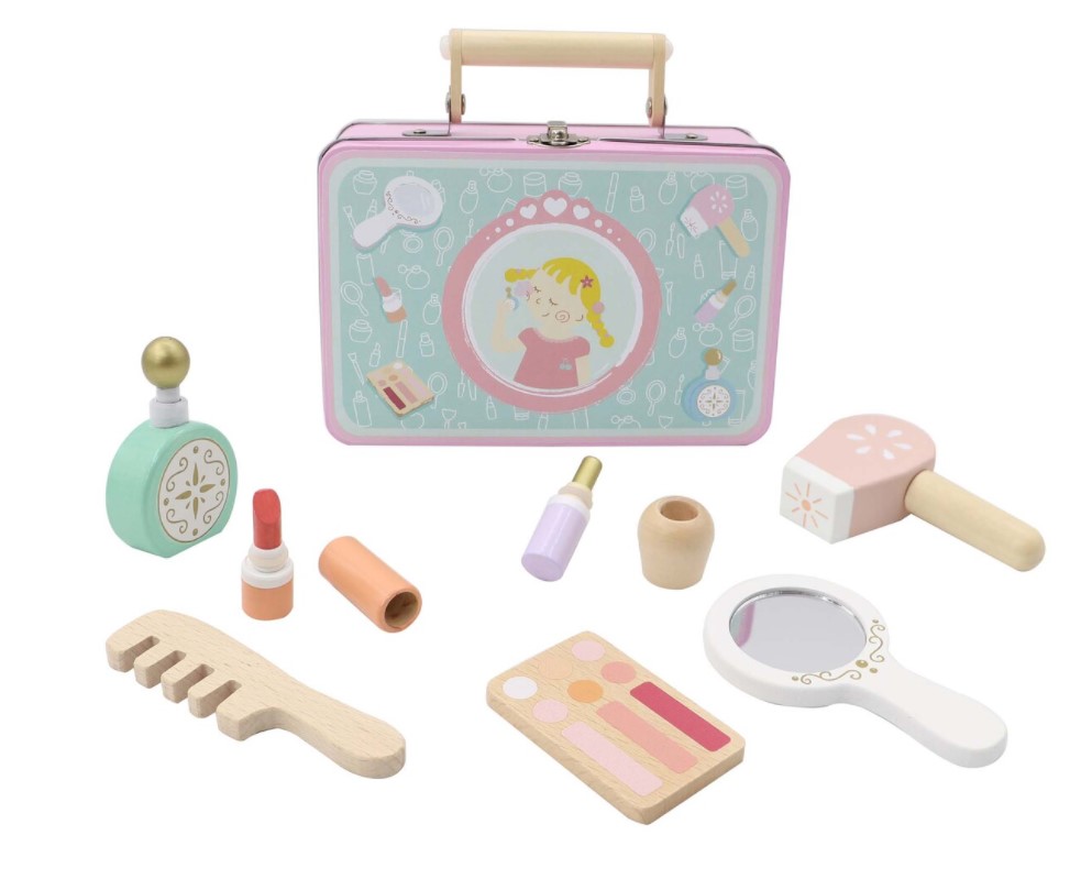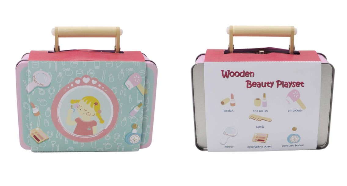Does your child copy you when you are putting on makeup? This Wooden Beauty Playset in Tin Case is perfect for pretend play.