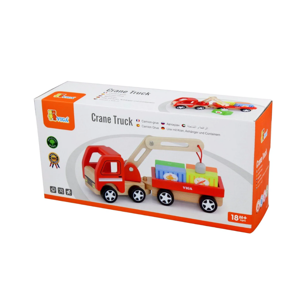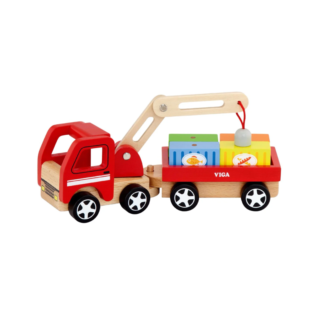 Add a whole new level of play with this fun, moving Wooden Crane Truck. With a swiveling trailer, magnetic crane arm and containers to unload, no town is truly complete without a crane truck! Perfect for imaginative play.