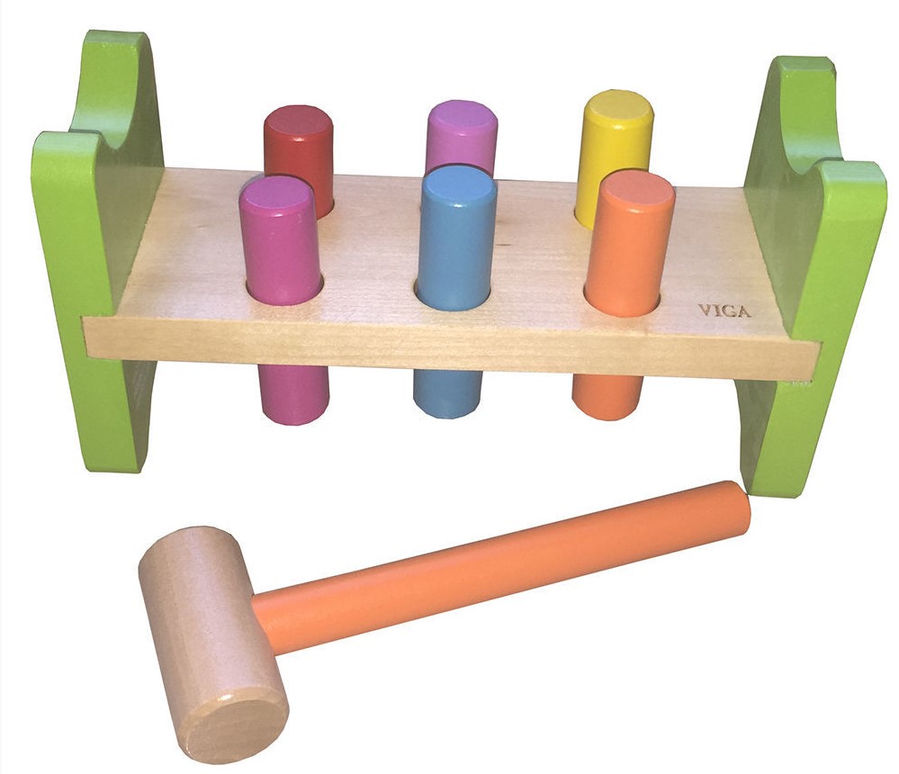 Great quality classic educational wooden toy. This colourful Wooden Hammering Peg Bench will help kids develop hand-to-eye coordination and provide lots of entertainment.