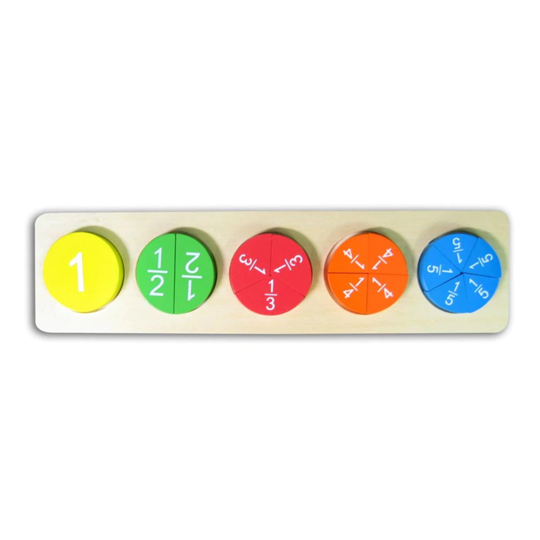 Introduce early fractions with this cute and colourful Chunky Wooden Fraction Puzzle. This set of five wooden fraction circles represents wholes, halves, thirds, quarters and fifths, and has the corresponding fraction written on each piece.