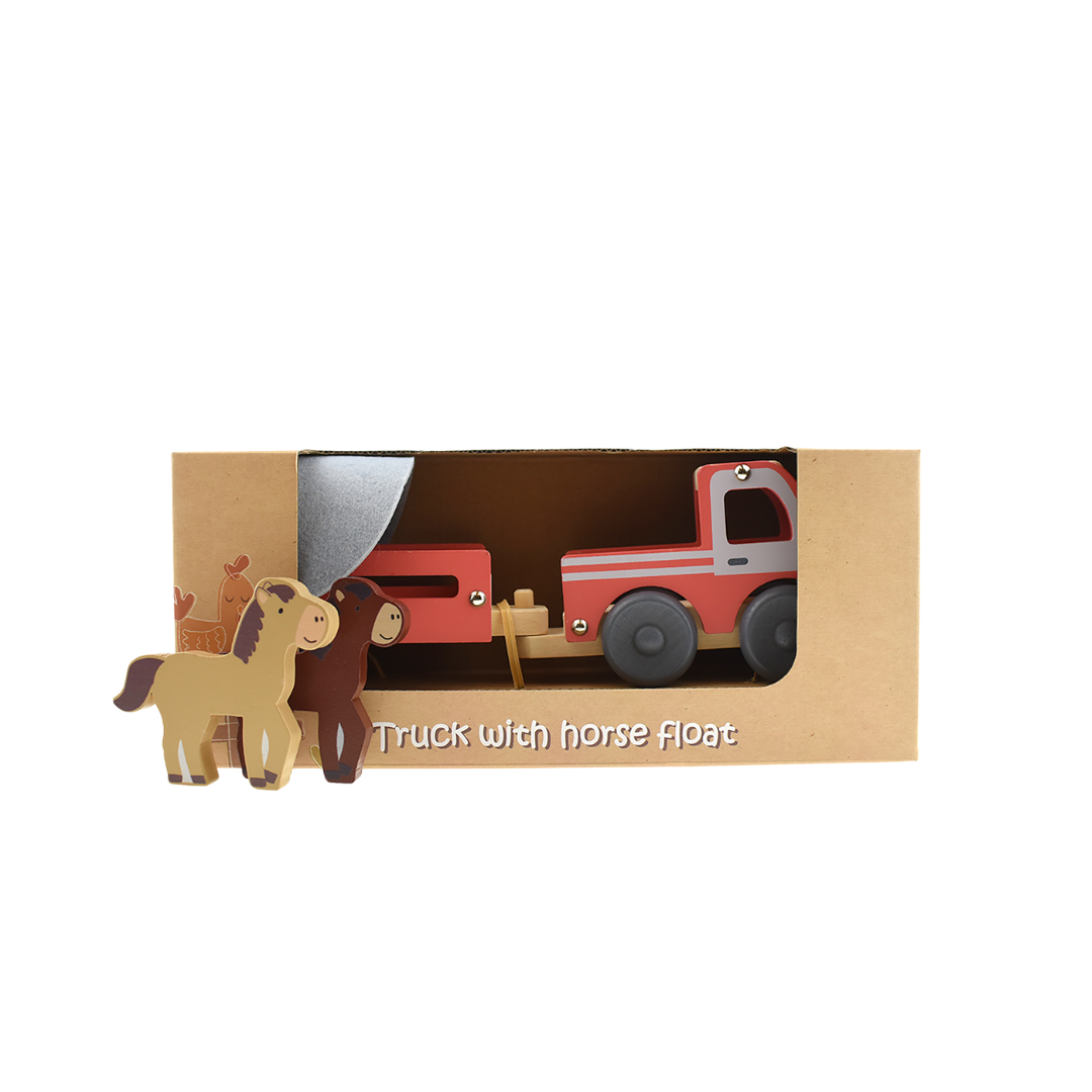 This Wooden Truck & Horse Float stimulates open ended play, as children learn about animals, nature and the world around them. They practice responding to different scenarios, which grows problem solving, communication, imagination and team work. Encourages creativity as toddlers and children make up story lines and play together.