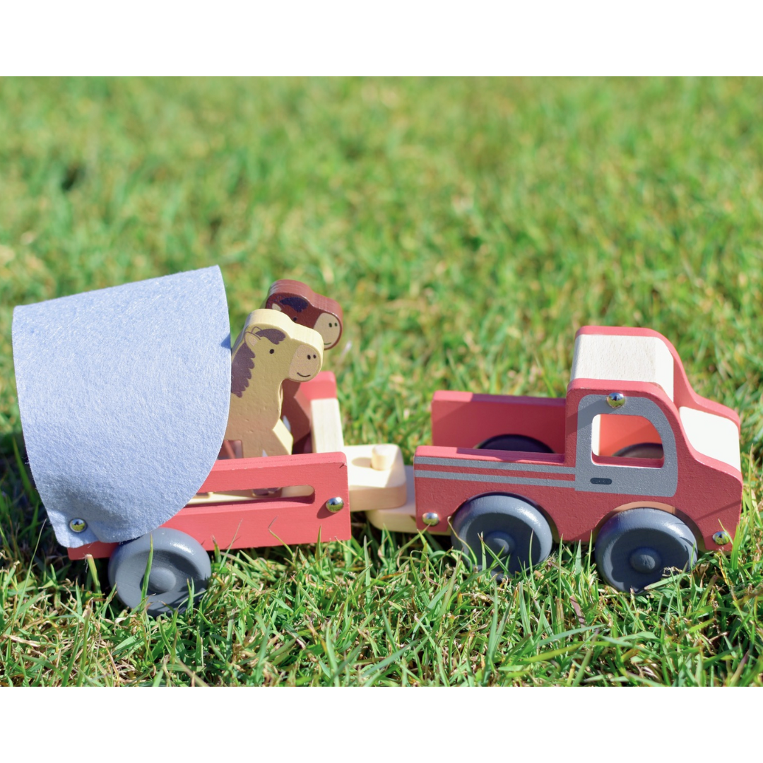 Pull along your two horses with this stylish Red Wooden Truck & Horse Float set. It contains a sturdy red truck, which attaches to the red horse float trailer, and fits both wooden horses inside.