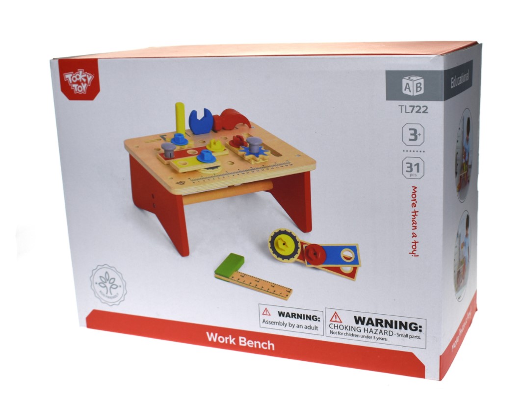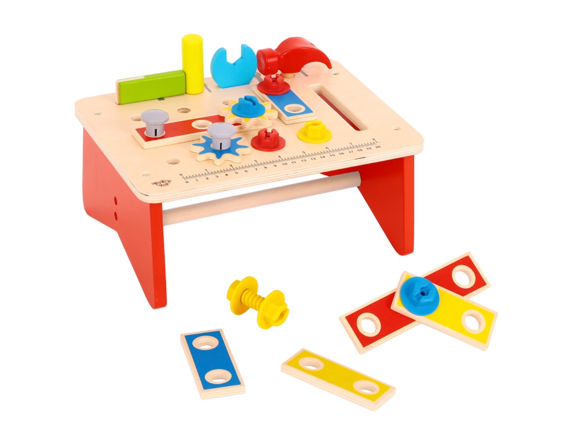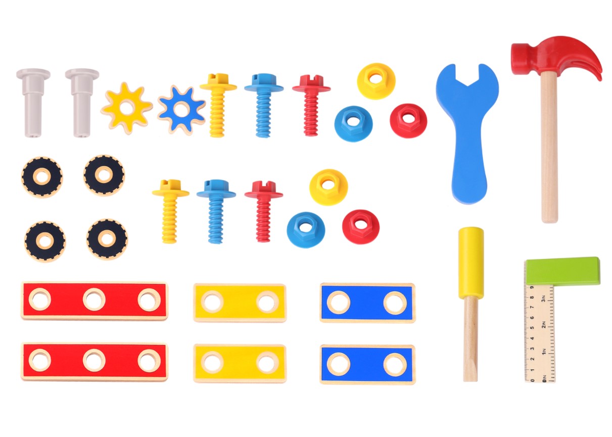 The Wooden Work Bench Playset has 31 pieces included are a hammer, nuts and bolts, gears, pins, spanner, screwdriver, set square etc., everything for the little budding carpenter.