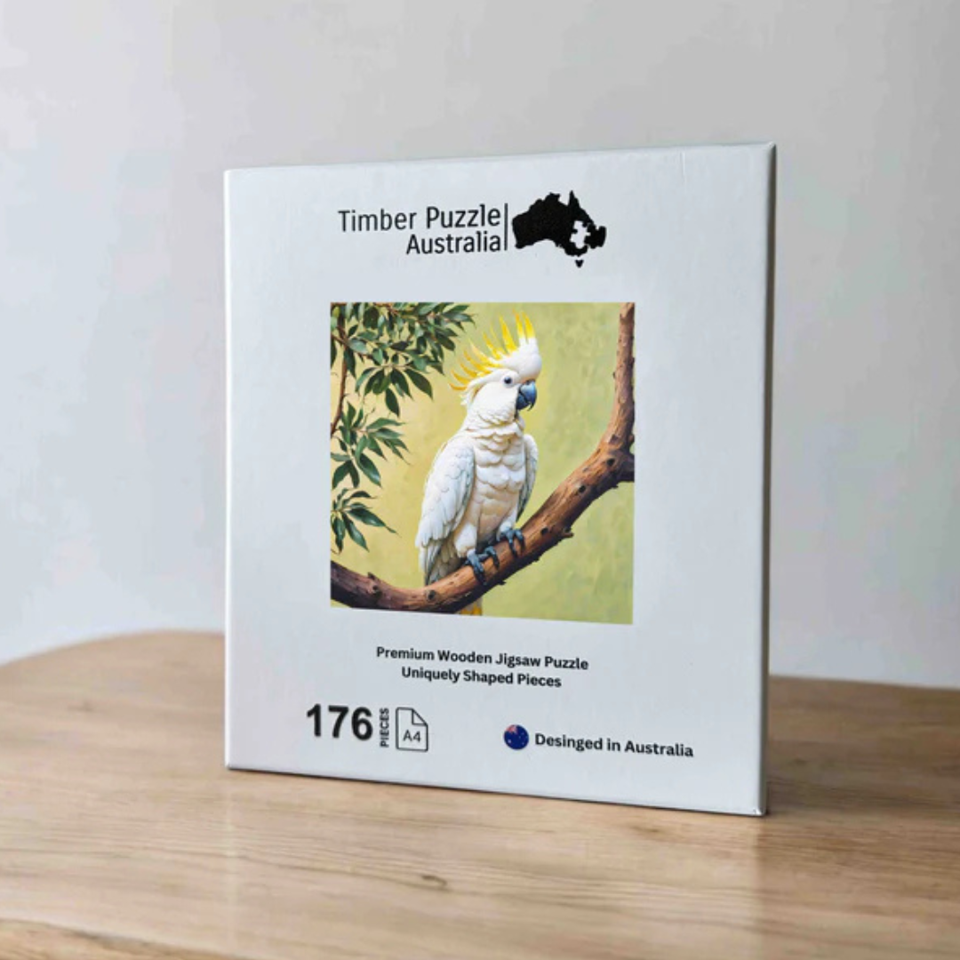The Yellow-Crested Cockatoo 176-piece Timber Puzzle showcases a majestic Australian bird, known for its loud squawk, cheeky behavior, and tendency to nibble on everything—from leaves and trees to verandah railings.
